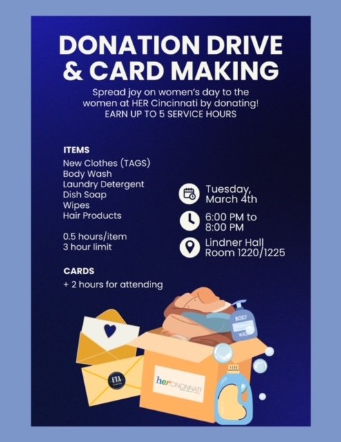 Come join us for a great service opportunity benefitting the residents of HER Cincinnati. Get some service hours by donating new clothes with tags attached, body wash, laundry detergent, dish soap, wipes, and hair products. Additionally, you can create cards for the residents and earn up to 2 additional service hours for a max of 5. We will have pizza and other snacks so come stop by and enjoy !