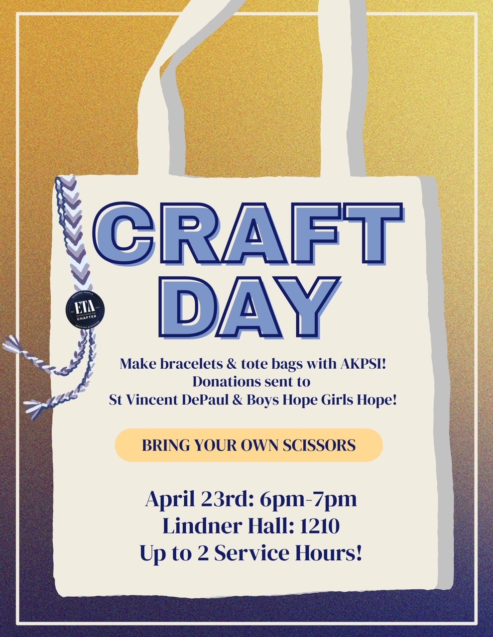 Join us to create fun bracelets and tote bags for St Vincent DePaul and Boys Hope Girls Hope this April 23rd from 6-7pm in Lindner Hall 1210. Earn some volunteer hours while creating good for your neighbors.