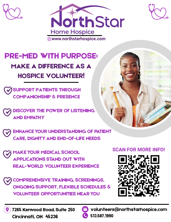 NorthStar Home Hospice has opportunities throughout Greater Cincinnati for UC pre-med students  who want to make a difference while being able to interact with patients and families facing terminal illnesses, learn about palliative care, and develop important communication and empathy skills. Additionally, hospice volunteer experience can be highly beneficial for medical school applications and
