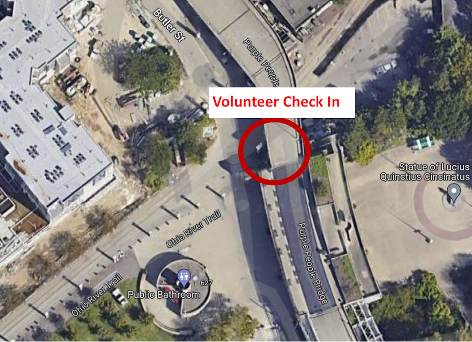 You will be provided with tools to pick up trash. Once you are done sweeping the area, you will take your trash to the Pride HQ/Festival Volunteer Check-In and dump it in the designated Rumpke dumpsters. Pride HQ/Festival Volunteer Check-In is pictured below at the end of Butler Street, under the Purple People Bridge.