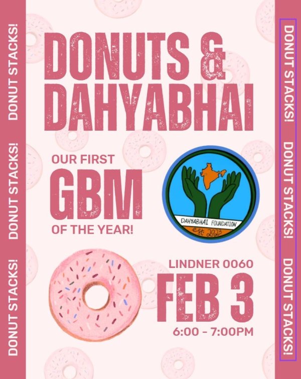 Come start off the semester with the Dahyabhai Foundation! We will be reintroducing our organization, presenting our new core team of leaders, providing information about service opportunities, and making posters for our Valentine's Day Bake sale! Oh and there's free donuts :) We will meet in Lindner 0060!
